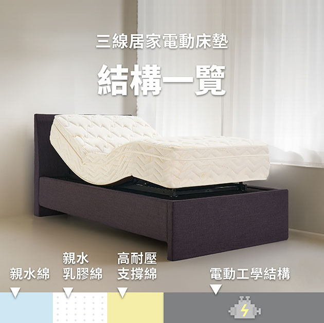 | 使用低噪音30分貝以下的省電馬達驅動,頭部可調整0°至70°,腳部可調整0°至40°,並搭配中鋼鐵材床架,打造出高品質舒適的電動床墊 |