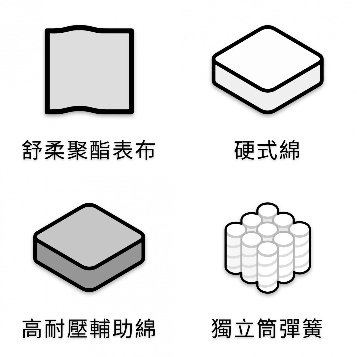 - 床墊分層:硬式綿、高耐壓輔助綿、合金鋼線獨立筒彈簧