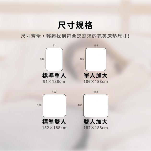 - 床墊尺寸:標準單人3尺、單人加大3.5尺、標準雙人5尺、雙人加大6尺,欲瞭解更多請見 床墊尺寸怎麼挑