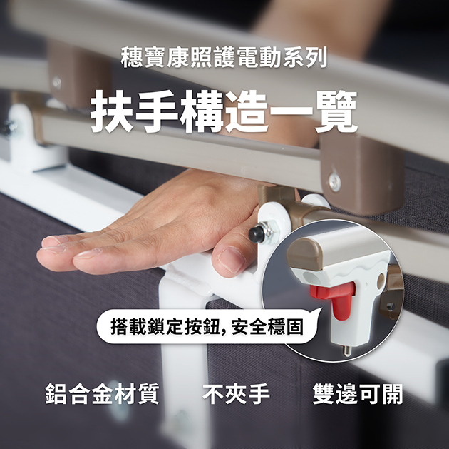 安心扶持,每一步都穩固!穗寶康照護電動床系列的扶手,採用堅固耐用的鋁合金材質,加上貼心不夾手設計,讓使用者起臥更安心。雙邊皆可輕鬆開啟,搭載鎖定按鈕,提供您與被照護者最穩固、最安全的支撐。