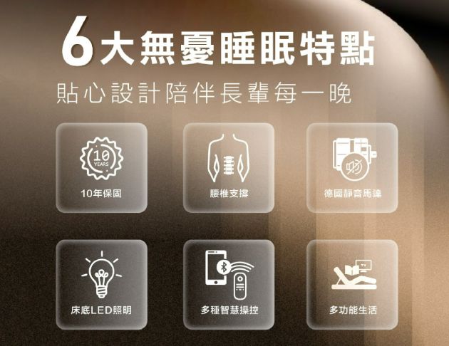 - 產品特色:四馬達醫療床結合電動無段式角度調整,並搭載頂腰功能貼合人體曲線,有效減輕腰腹壓力,讓日常起居、休息與照護更加輕鬆舒適,全面提升生活品質。