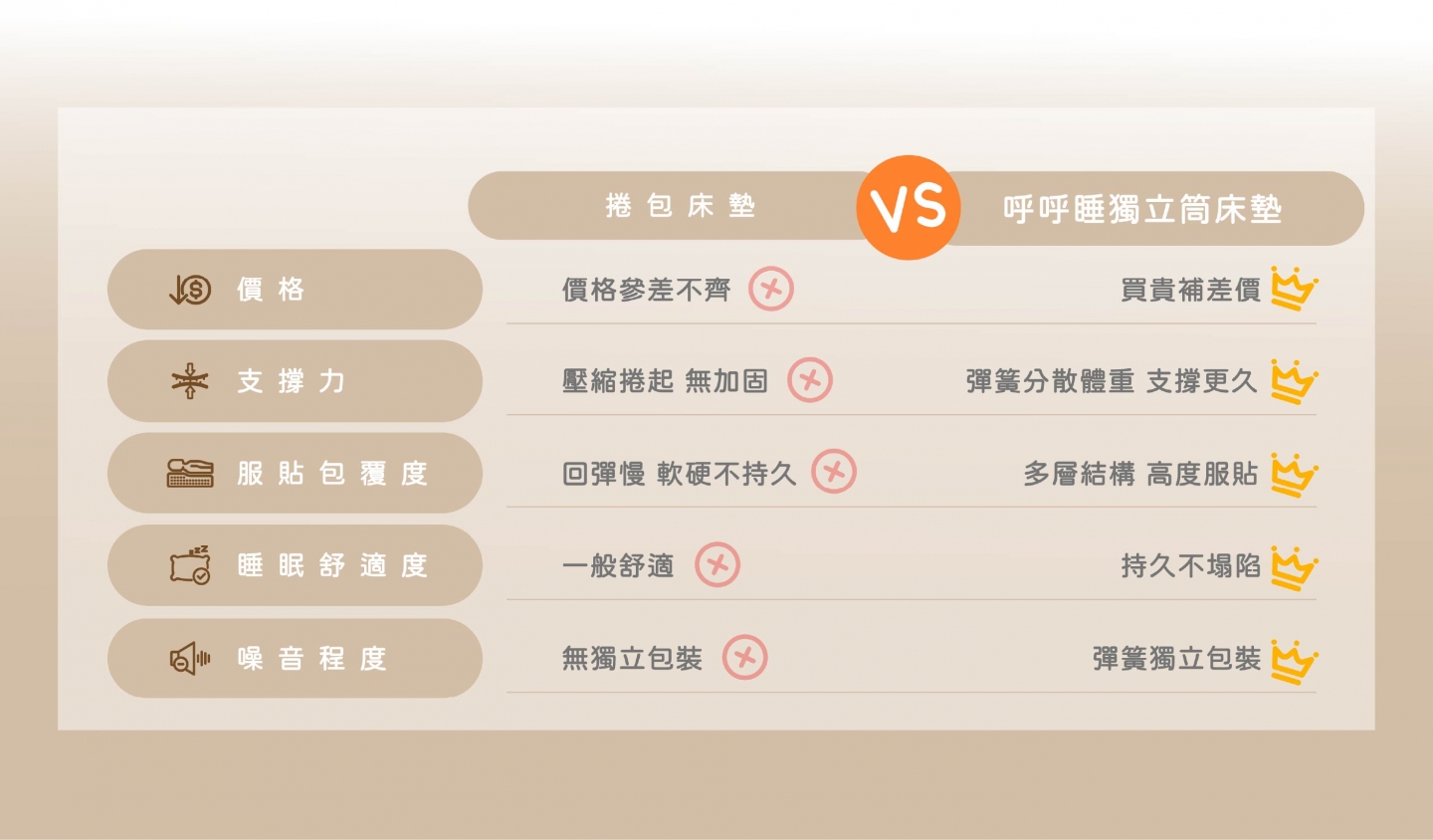 買床別再當盲盒玩家!呼呼睡公開材質和獨立筒顆數,還有床墊價格優勢(買貴退差價),睡得舒適又買得放心。