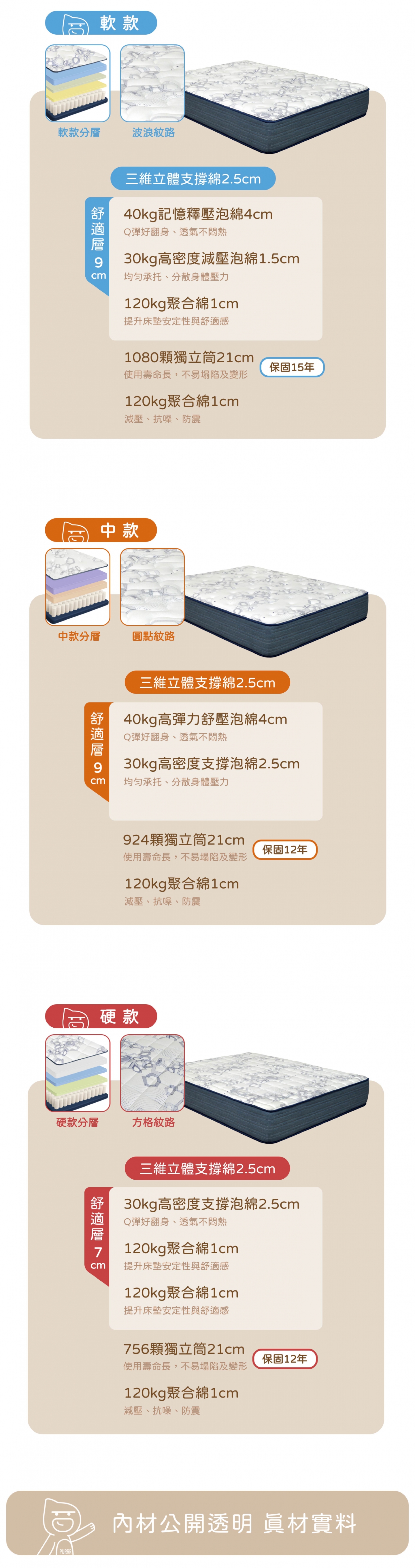 多層內材結構滿足不同需求,舒適與支撐分層保固清楚,
