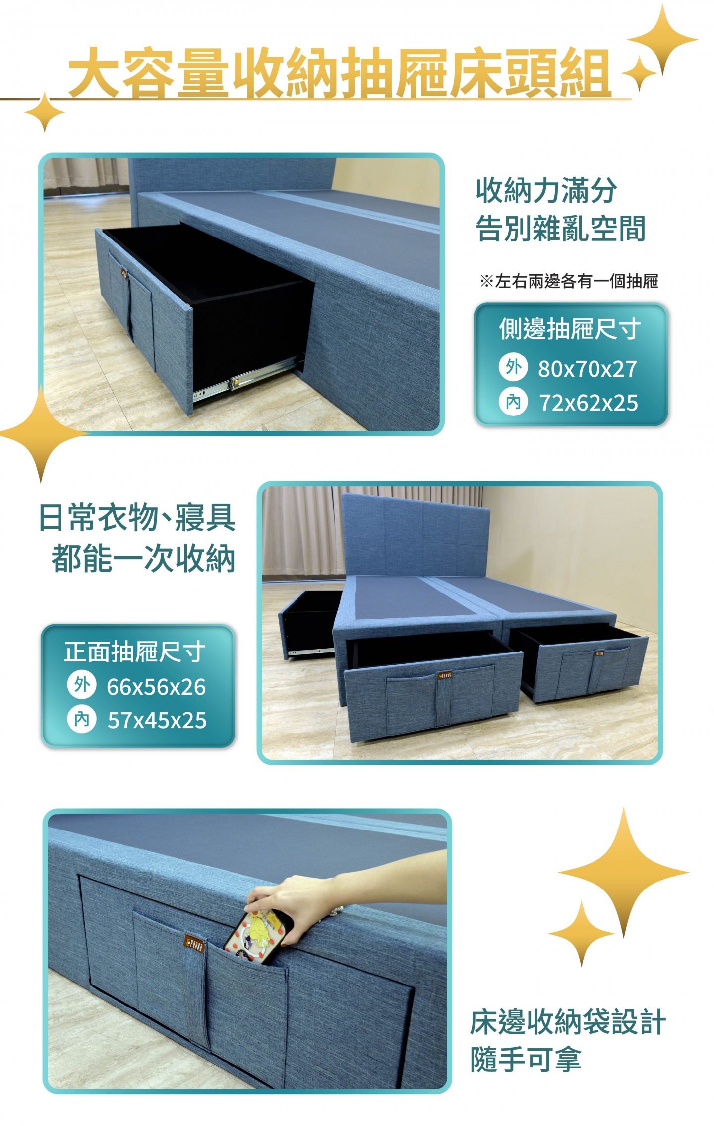 左右側與床尾皆設有抽屜,充分利用每一寸空間告別凌亂居家