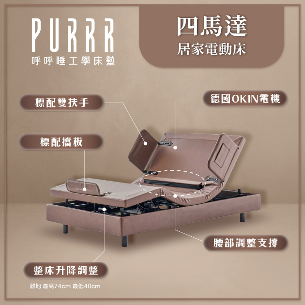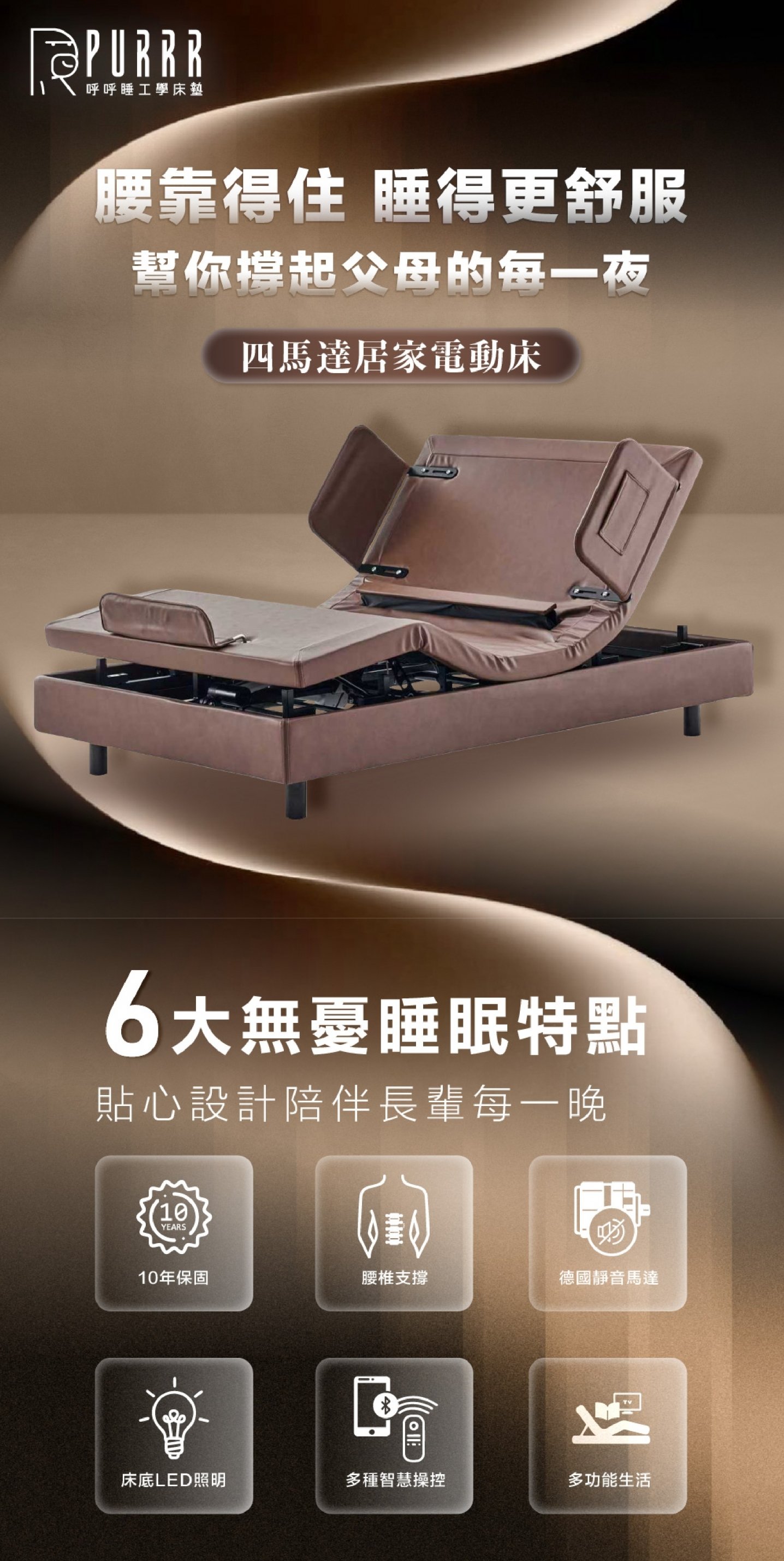 - 產品特色:四馬達醫療床結合電動無段式角度調整,並搭載頂腰功能貼合人體曲線,有效減輕腰腹壓力,讓日常起居、休息與照護更加輕鬆舒適,全面提升生活品質。