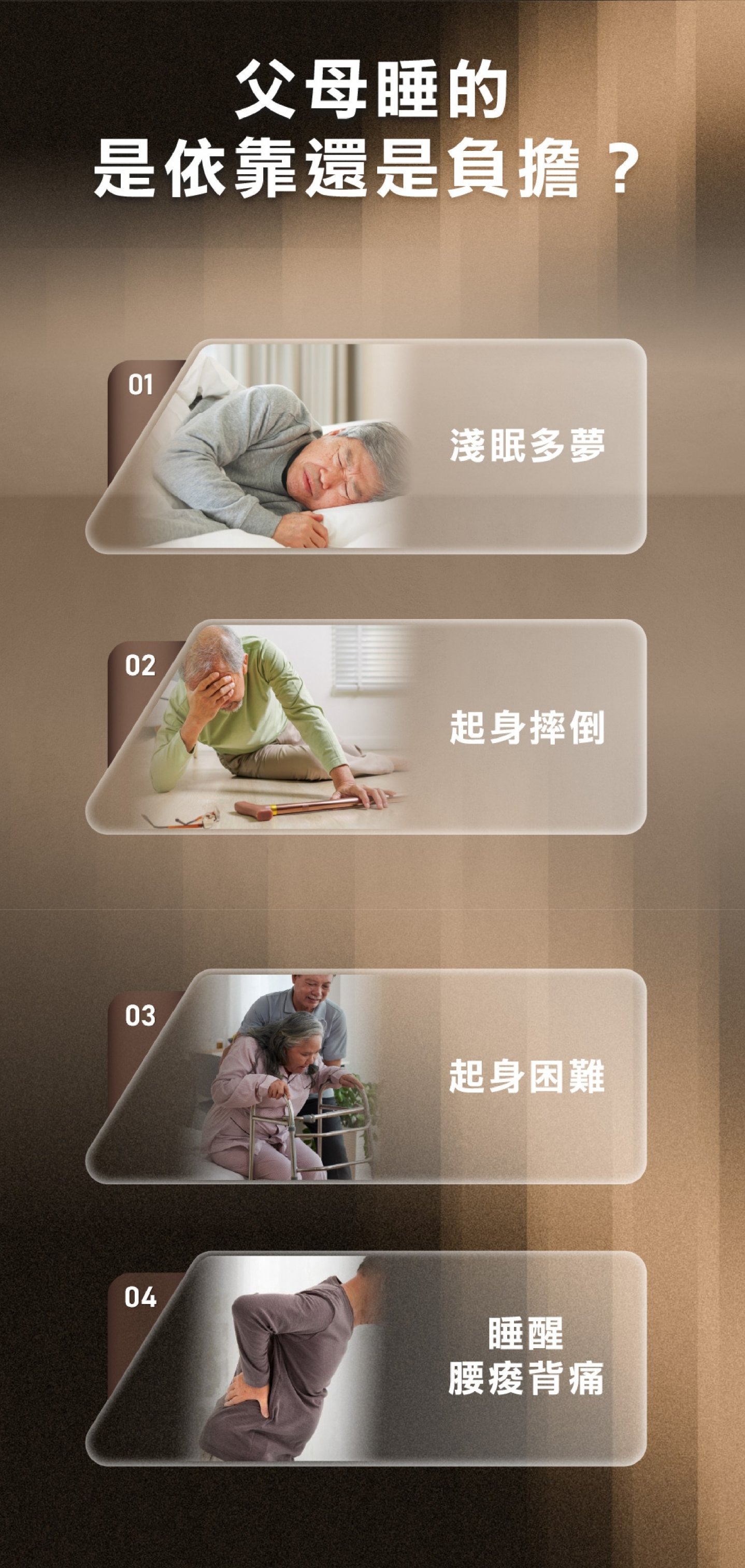 解決長輩睡眠與起身困擾,幫助長輩 更好入睡、起身更輕鬆、生活更安全。