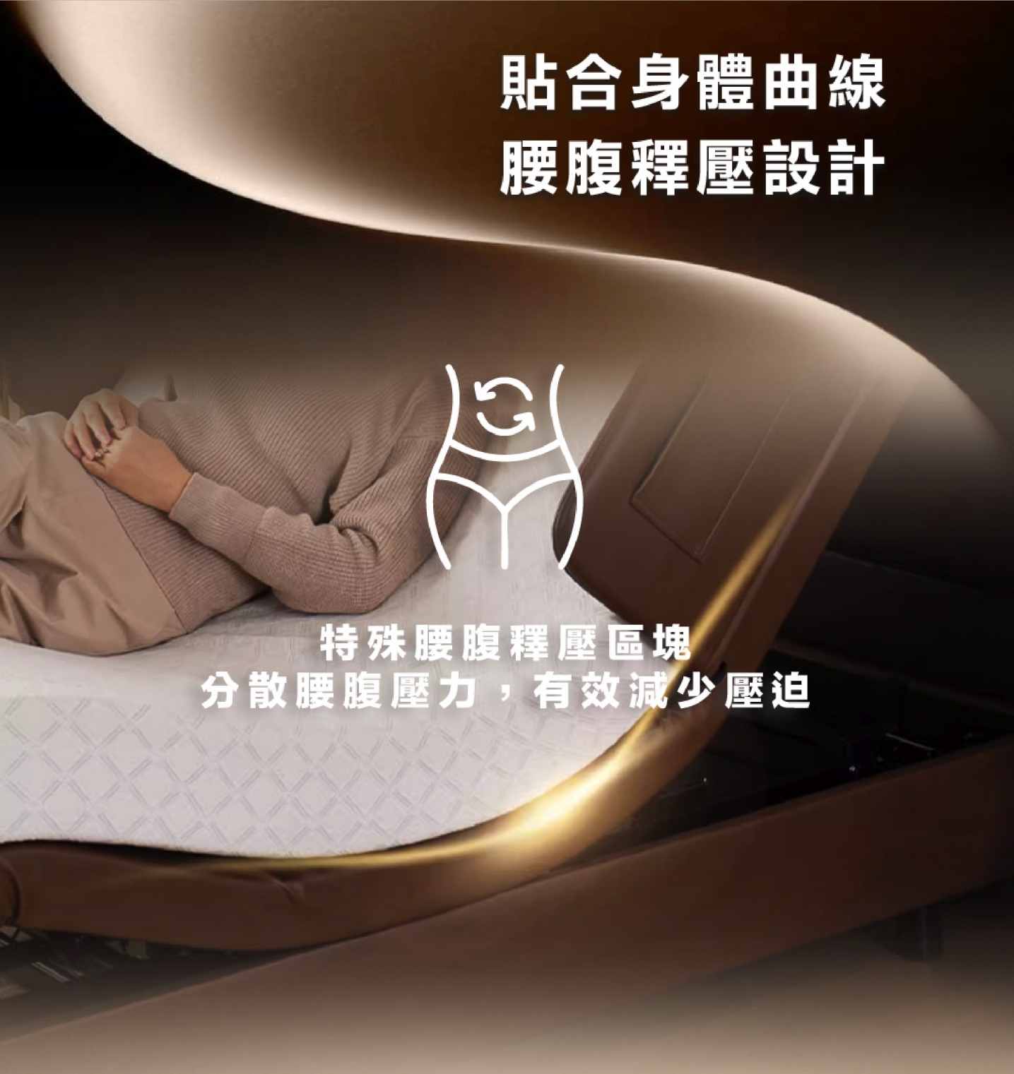 | ✓ | 貼合身體曲線的腰腹釋壓設計,透過腰部獨立支撐,完整貼合S曲線,有效減少腰腹壓迫,久躺也不易腰痠背痛 |