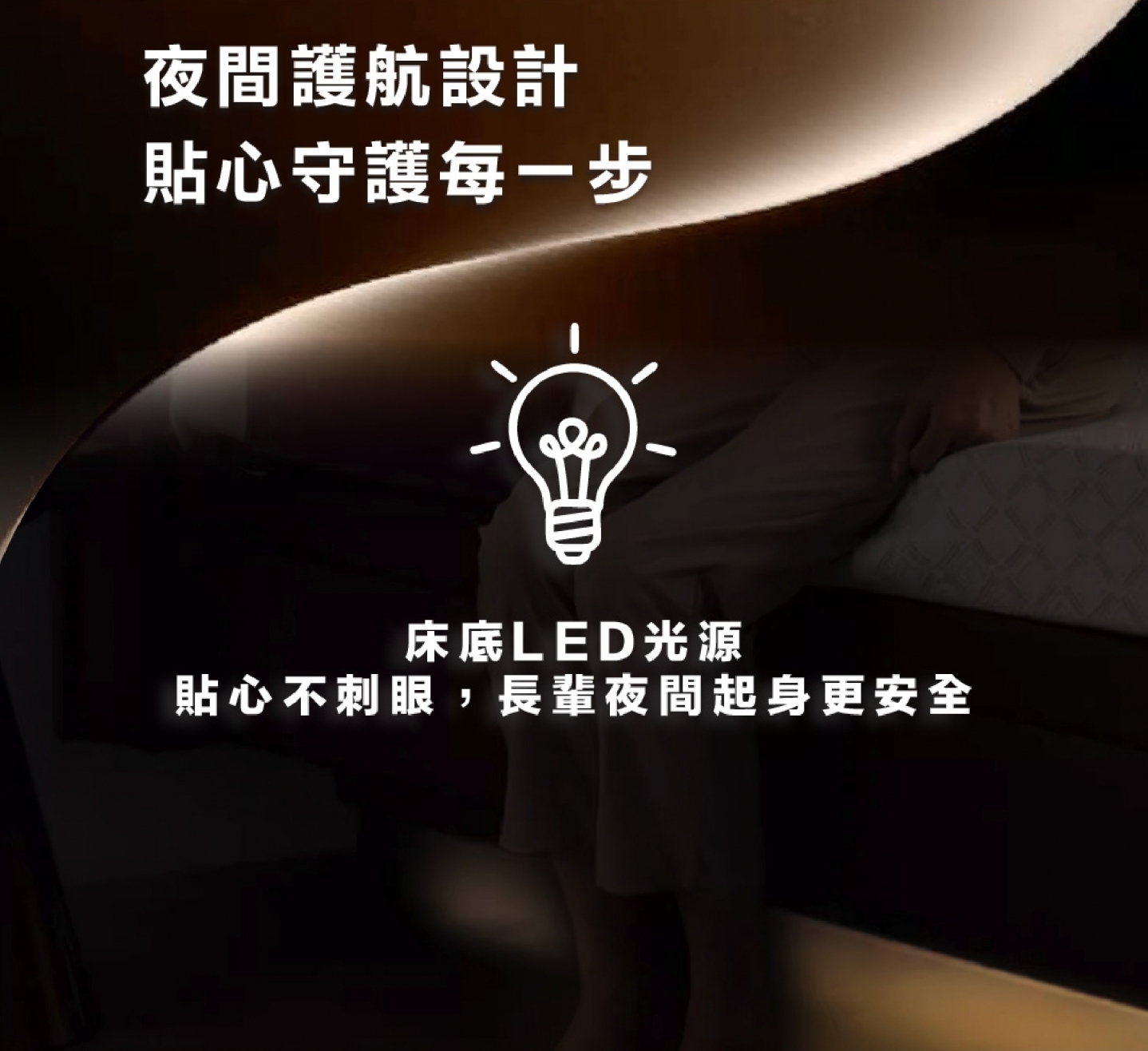 床底LED燈設計,提供柔和光源不刺眼,夜晚起身也能安全行走。
