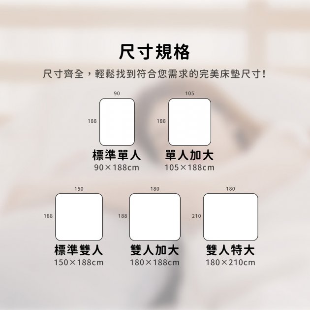 - 床墊尺寸:標準單人3尺、單人加大3.5尺、標準雙人5尺、雙人加大6尺、雙人特大7尺,欲瞭解更多請見 床墊尺寸怎麼挑
