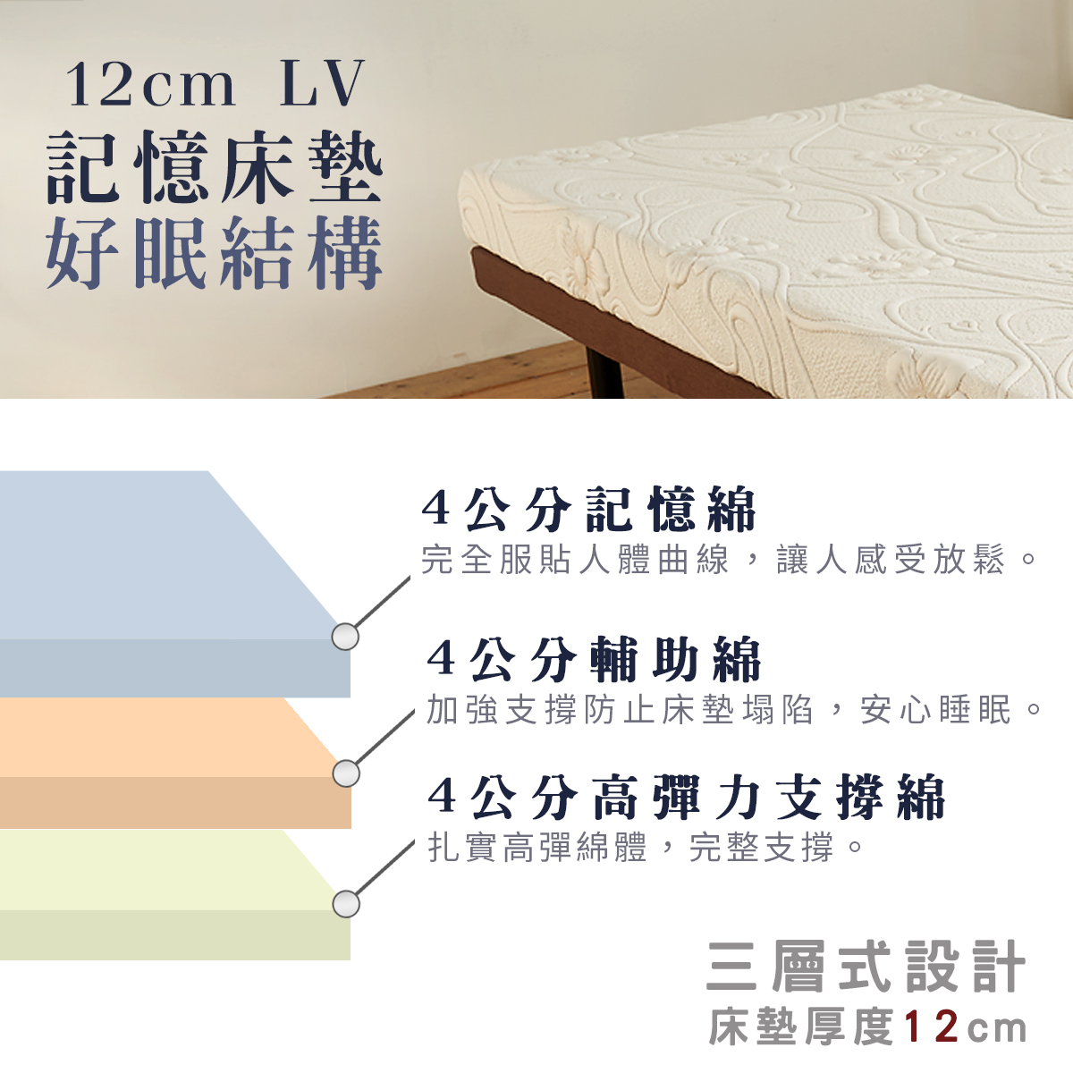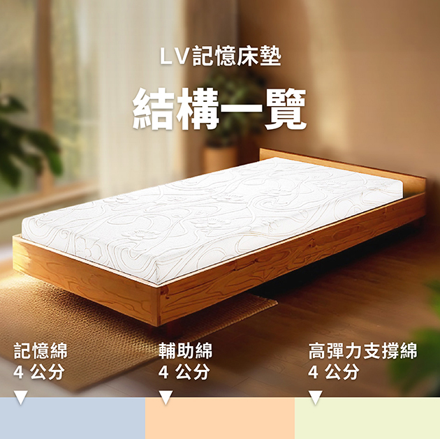 - 床墊分層:記憶綿、輔助綿、高彈力支撐綿