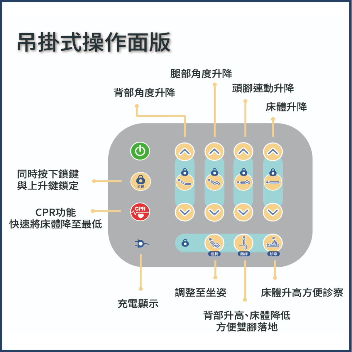 | ✓ | 床體頭部、腳部、床身具升降功能,自由調整角度方便照護 |