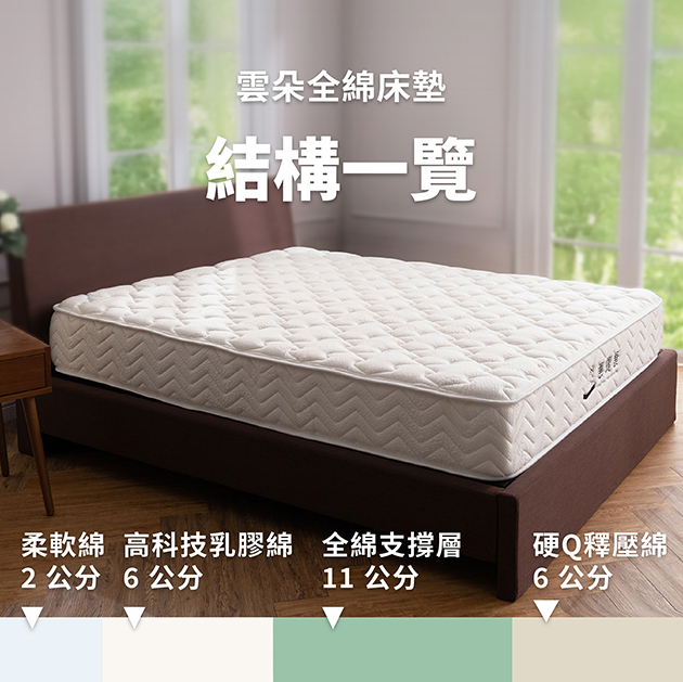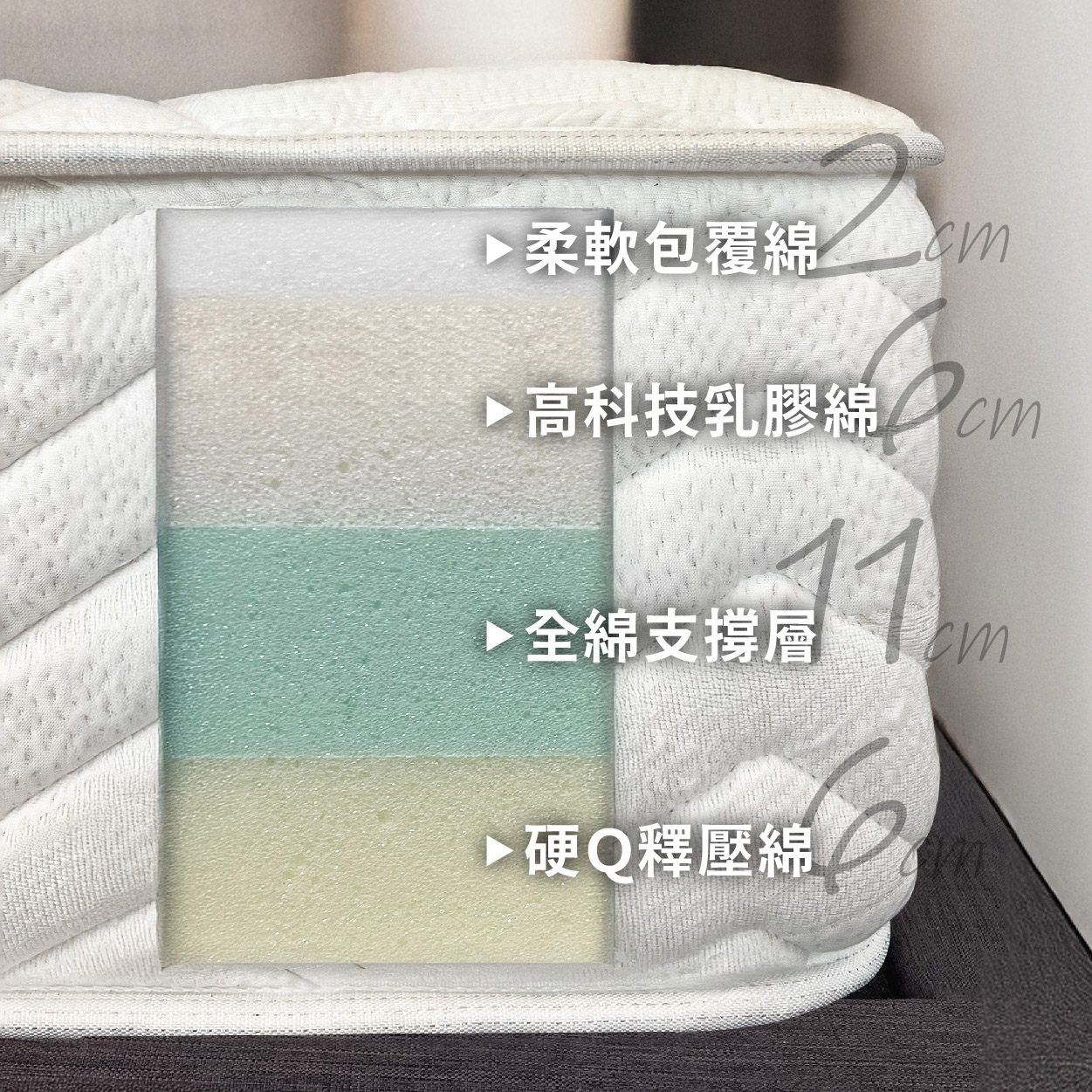 - 床墊分層:柔軟包覆綿、高科技乳膠綿、全綿支撐層、硬Q釋壓綿