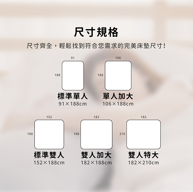 - 床墊尺寸:標準單人3尺、單人加大3.5尺、標準雙人5尺、雙人加大6尺、雙人特大7尺,欲瞭解更多請見 床墊尺寸怎麼挑