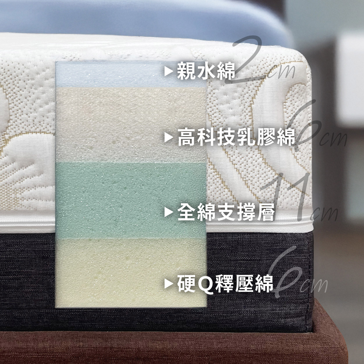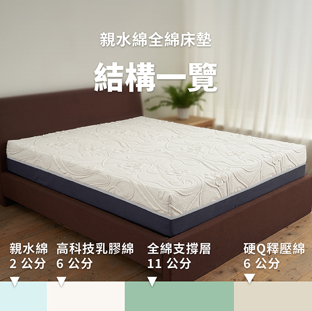 - 床墊分層:親水綿、高科技乳膠綿、全綿支撐層、硬Q釋壓綿