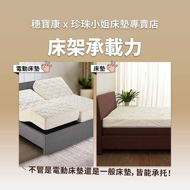 穗寶康經典床架,不僅穩固防滑,更具有優越的載重強度,能穩固承載電動床墊。告別電動床墊只能放地上的煩惱,讓您的臥室空間更加靈活多變。