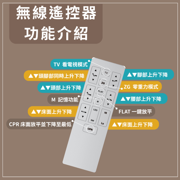 - 產品特色:四馬達醫療床結合電動無段式角度調整,並搭載頂腰功能貼合人體曲線,有效減輕腰腹壓力,讓日常起居、休息與照護更加輕鬆舒適,全面提升生活品質。